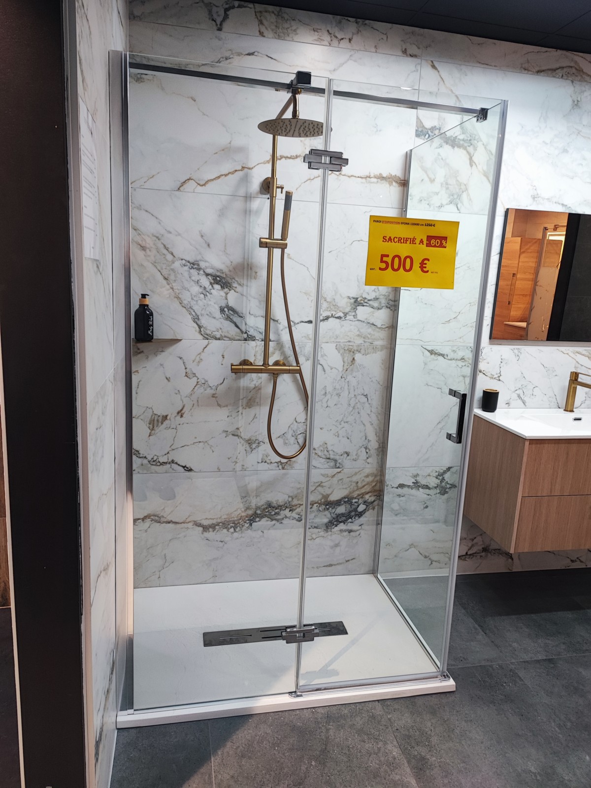 pour douche à l'italienne dimension 120x80 cm , comprenant une façade de 120 cm avec porte pivotante sur partie fixe et un retour fixe de 80 cm